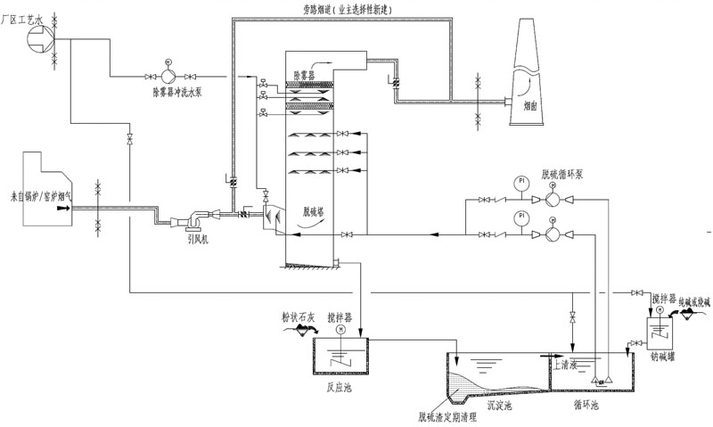 煙氣經(jīng)煙道從塔底進入脫硫塔。在脫硫塔內(nèi)布置若干層噴淋霧化層,噴出細微液滴霧化均布于脫硫塔溶積內(nèi),煙氣與噴淋脫硫液進行充分汽液混合接觸,使煙氣中SO2和灰塵被脫硫液充分吸收、反應(yīng),達到脫塵除SO2的目的。經(jīng)脫硫洗滌后的凈煙氣經(jīng)塔頂除霧器脫水,經(jīng)脫硫塔上部進入煙囪排入大氣。脫硫循環(huán)液經(jīng)塔內(nèi)氣液接觸除SO2后,經(jīng)塔底管道流入沉淀池在此將灰塵沉淀下來,清液經(jīng)上部溢進入反應(yīng)再生池,在池內(nèi)與石灰乳液制備槽引來的石灰乳進行再生反應(yīng),再生液流入泵前循環(huán)槽補入Na2CO3,由泵打入脫硫塔頂脫除SO2循環(huán)使用。其中再生產(chǎn)出的CaSO3及煙氣中過剩氧生成的CaSO4于沉淀池中沉淀分離。