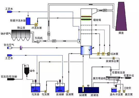 1、石灰(石灰石)—石膏法脫硫工藝為濕式脫硫工藝。工藝流程簡單,技術(shù)成熟、可靠,是目前國內(nèi)外煙氣脫硫應(yīng)用較廣泛的脫硫工藝。